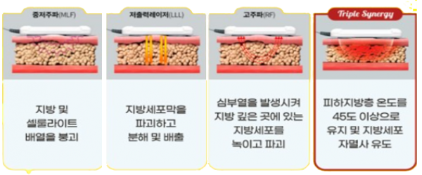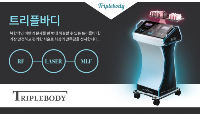 트리플바디는 저출력레이저, 고주파 및 중저주파를 이용한 3가지 기전의 복합적인 시술입니다. 특히 저출력레이저를 이용해 지방세포막을 파괴하고 고주파로 심부열을 발생시켜 지방층 깊숙한 곳에 있는 지방세포를 녹이고 파괴합니다.